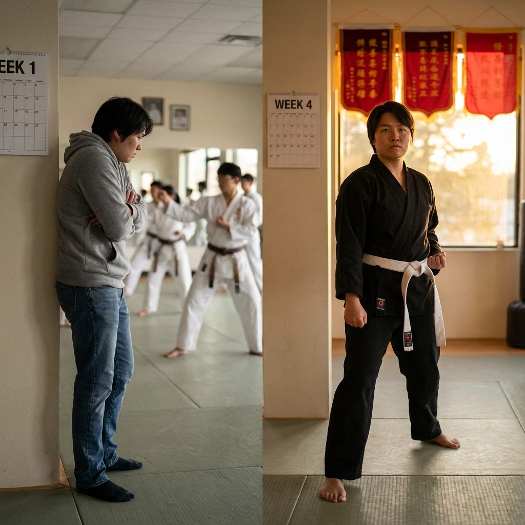 Week one: You struggle to remember basic stances. Your mind feels foggy trying to process new movements.